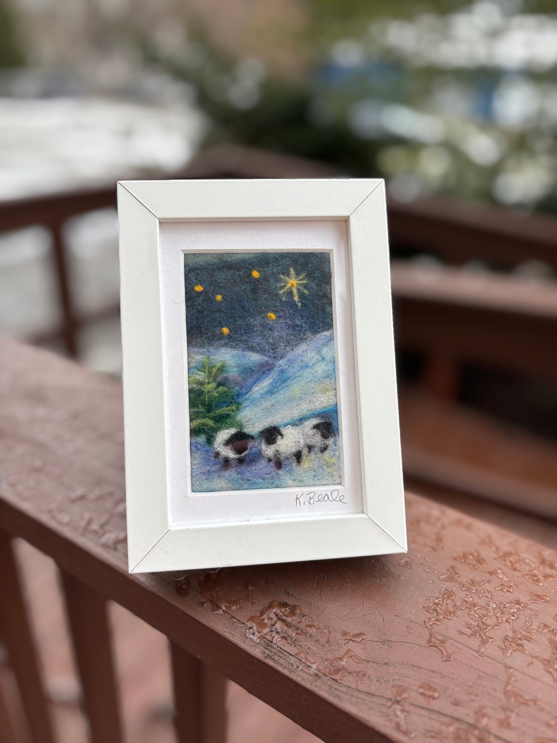 Paint with wool! In this needle felting workshop teacher, Kathie, will walk you through all the skills necessary to make your own Winter Landscape wool "painting". This 4" creation can be framed into a circle hoop or matted as a 4x6" painting.