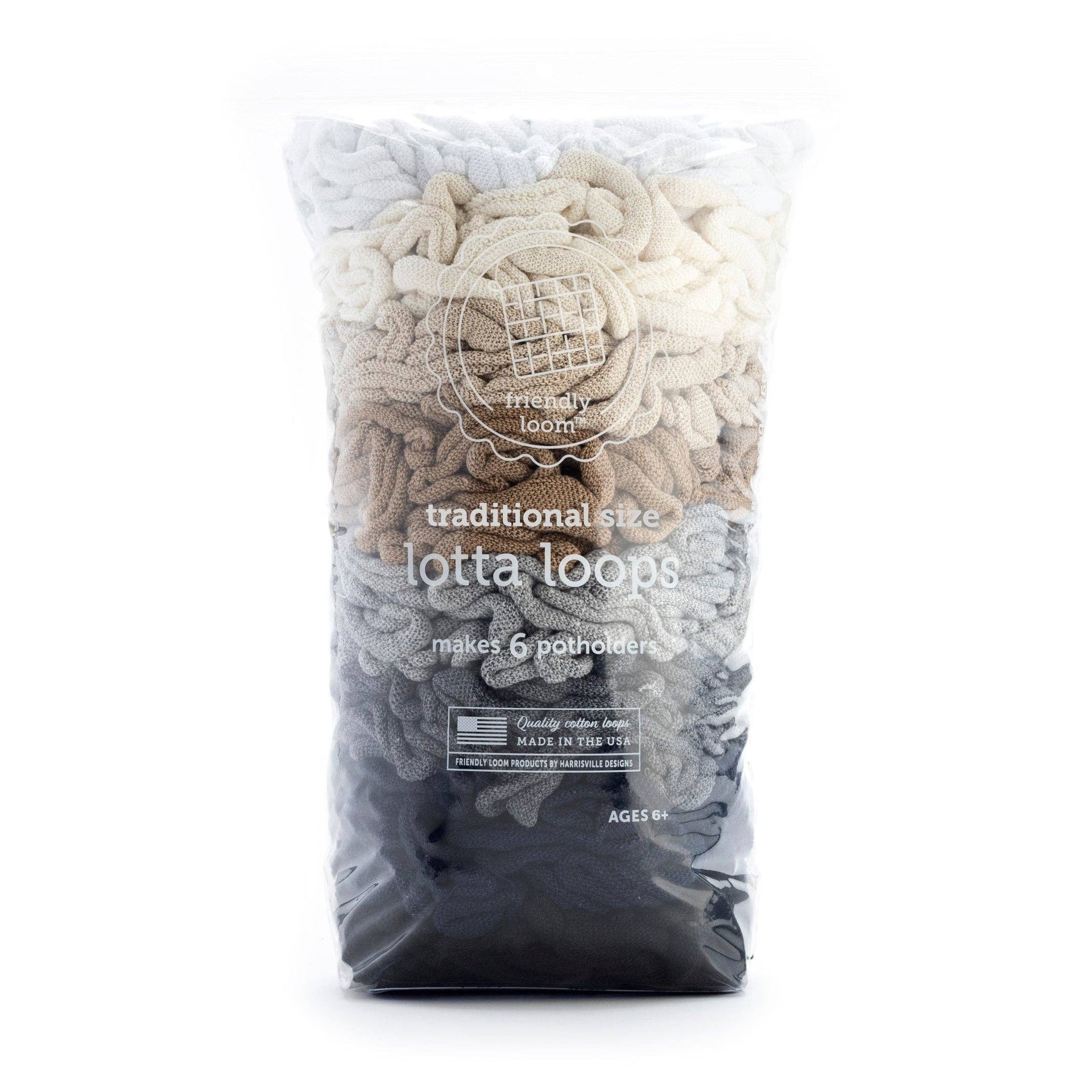 Loom and accessories are not included. Our loops are crafted from upcycled cotton fibers; colors may vary slightly. While the number of loops of each color may vary, bags are weighed to ensure they contain enough loops to make 6 potholders.
