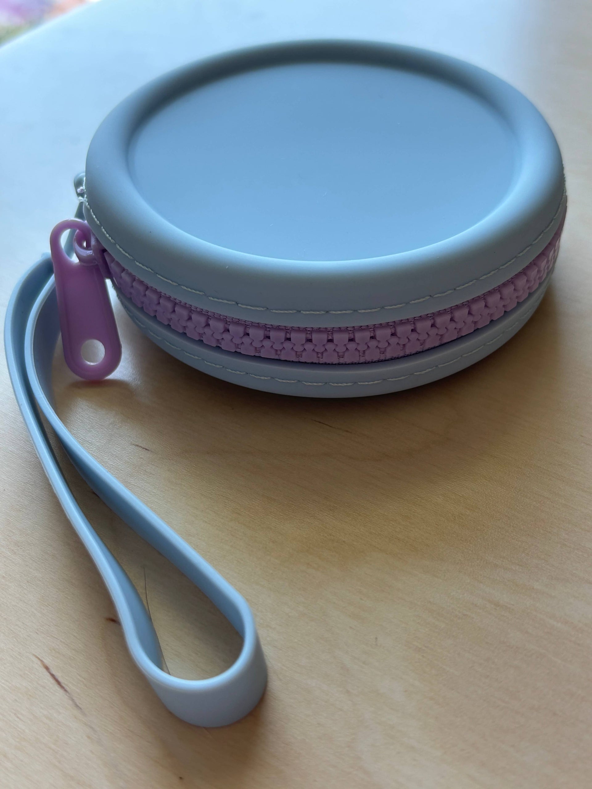 Body and wrist strap are made of 100% silicone, making for an irresistable squish and soft touch. Contrasting zippers made of plastic (teeth and pull) and polyester (thread and cloth). Silicone is waterproof (a perfect option for beach knitting!) and easy to wipe clean with a wet cloth.